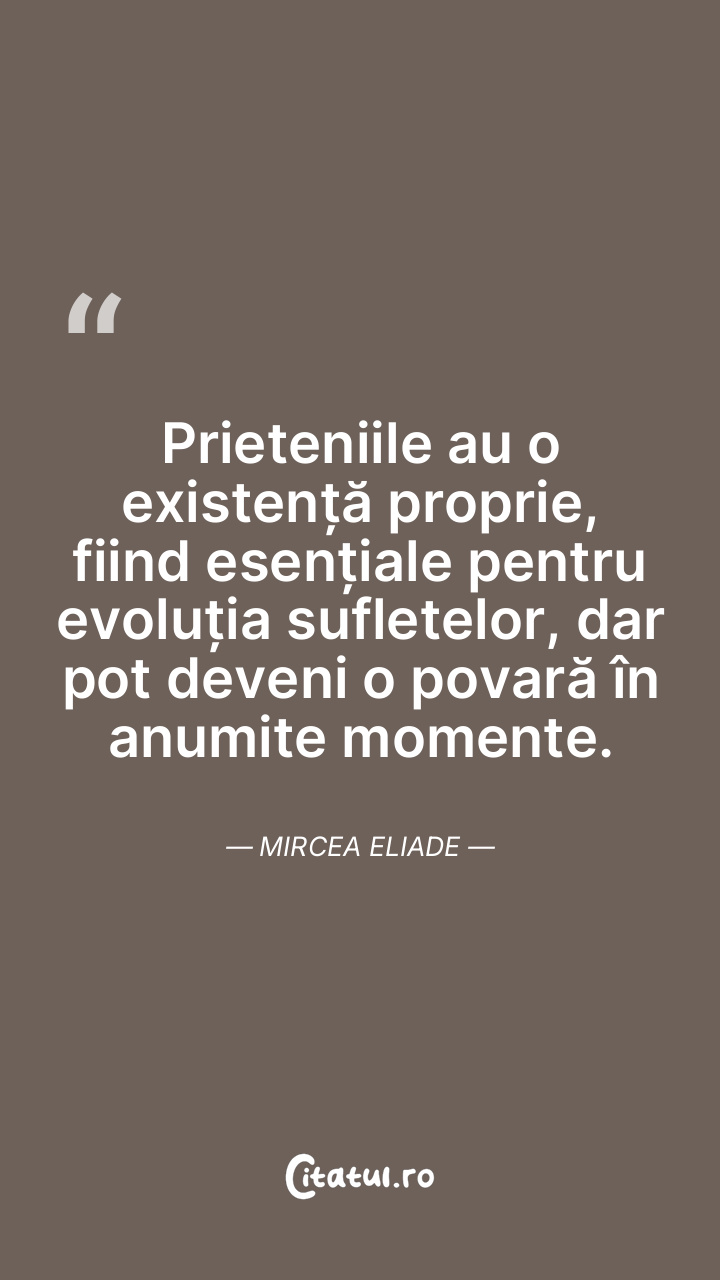 Prieteniile au o existență proprie, fiind esențiale pentru evoluția sufletelor, dar pot deveni o povară în anumite momente. Mircea Eliade