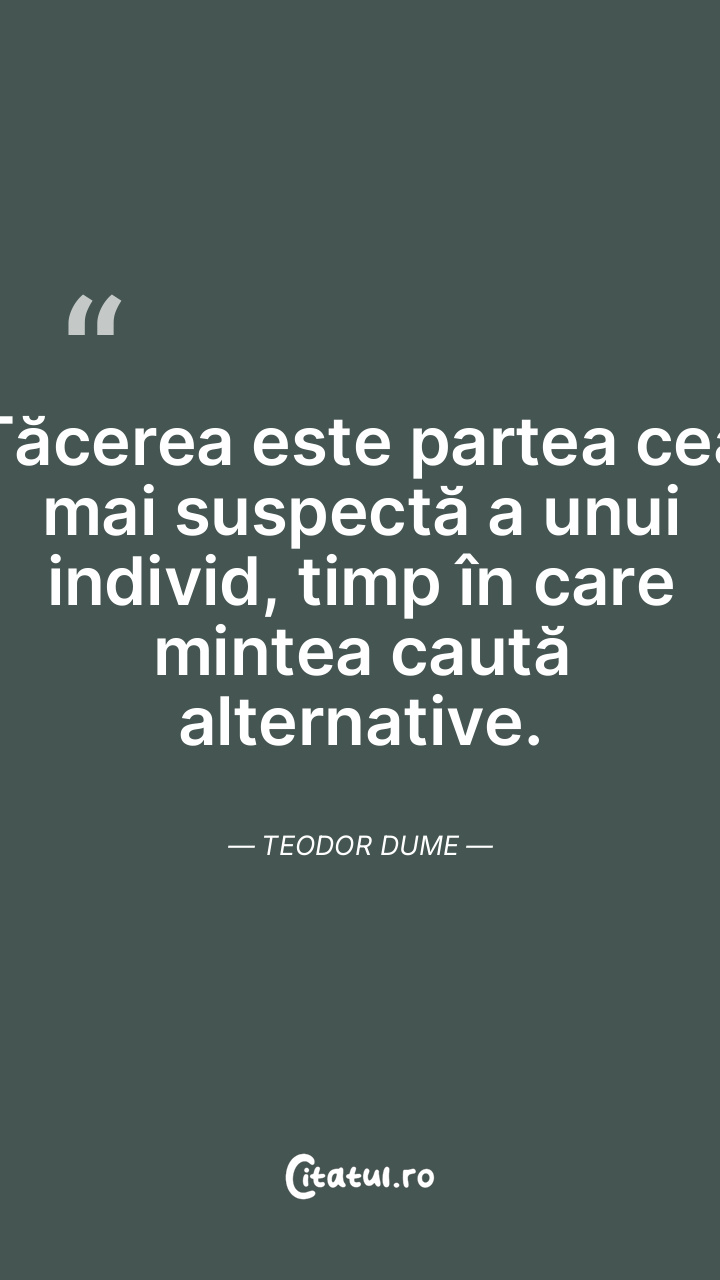 Tăcerea este partea cea mai suspectă a unui individ, timp în care mintea caută alternative. Teodor Dume