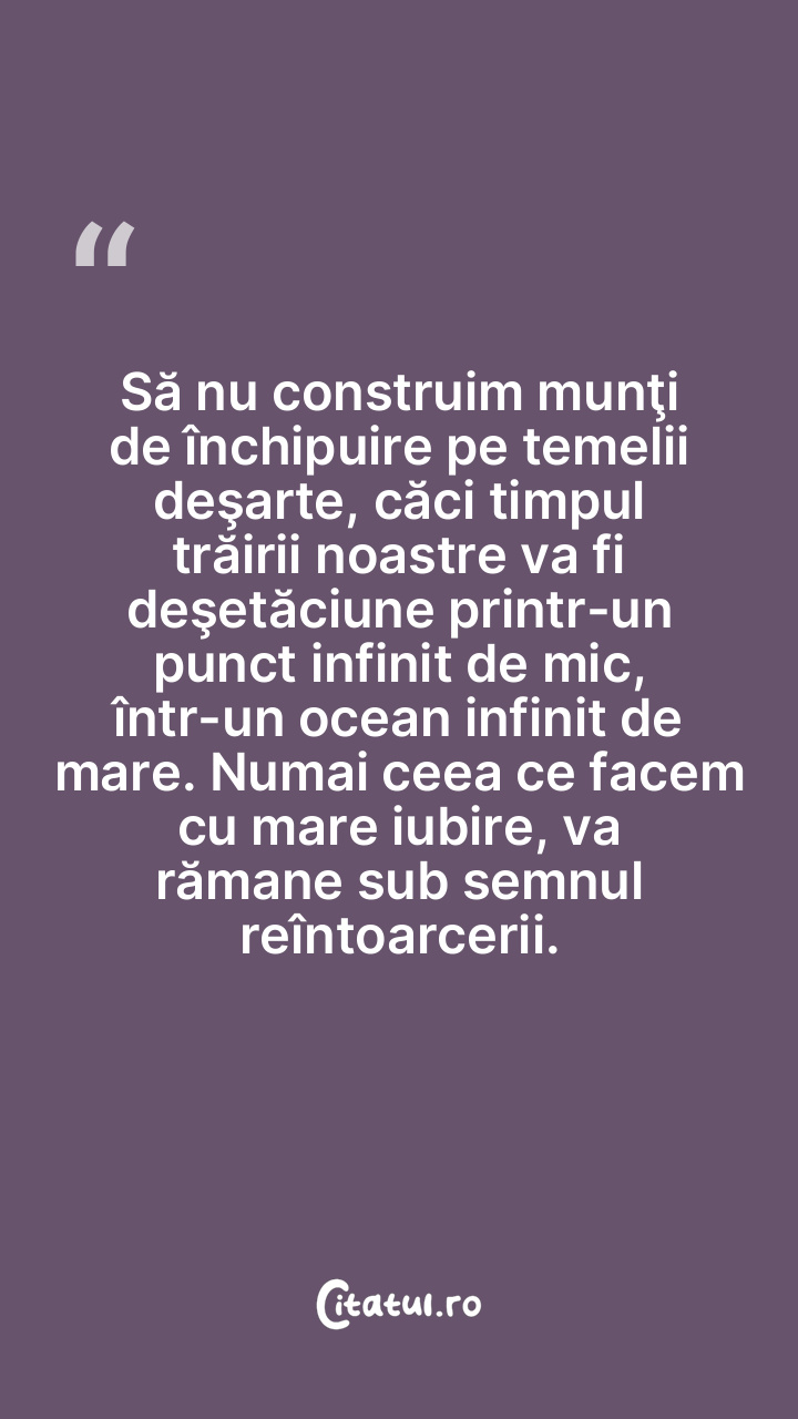 Să nu construim munţi de închipuire pe temelii deşarte, căci timpul trăirii noastre va fi deşetăciune printr-un punct infinit de mic, într-un ocean infinit de mare. Numai ceea ce facem cu mare iubire, va rămane sub semnul reîntoarcerii.