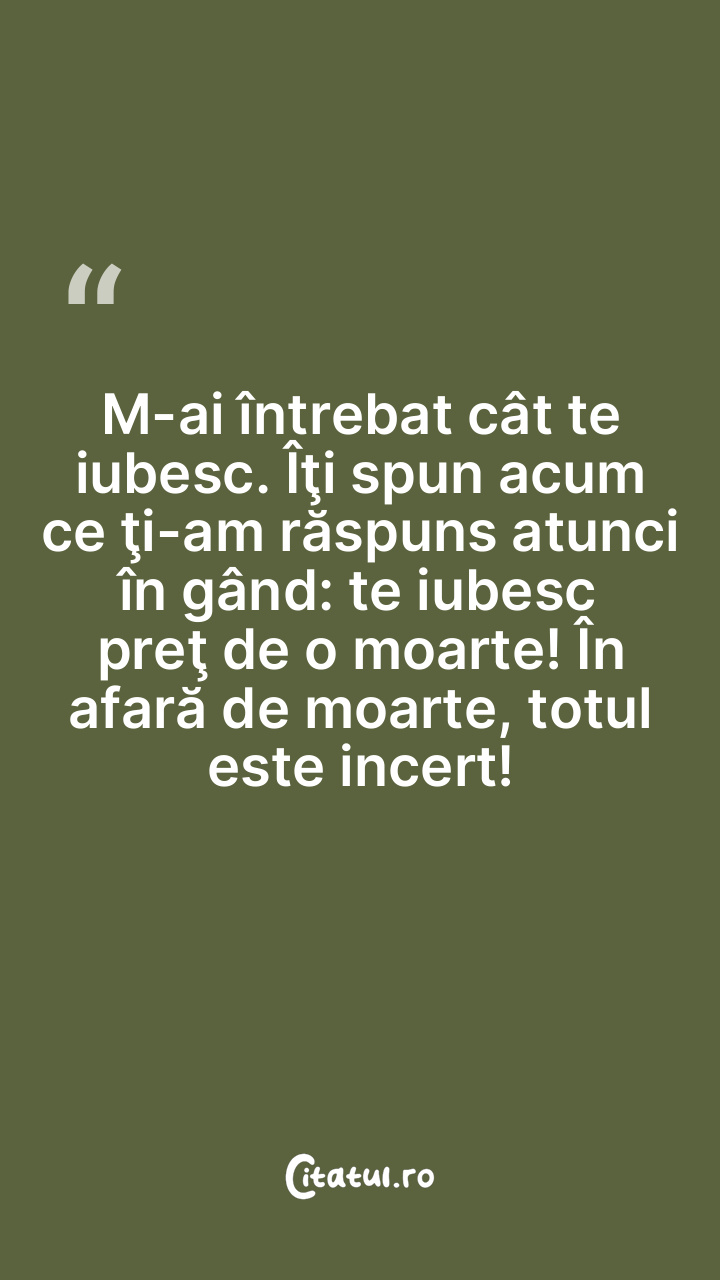 M-ai întrebat cât te iubesc. Îţi spun acum ce ţi-am răspuns atunci în gând: te iubesc preţ de o moarte! În afară de moarte, totul este incert!