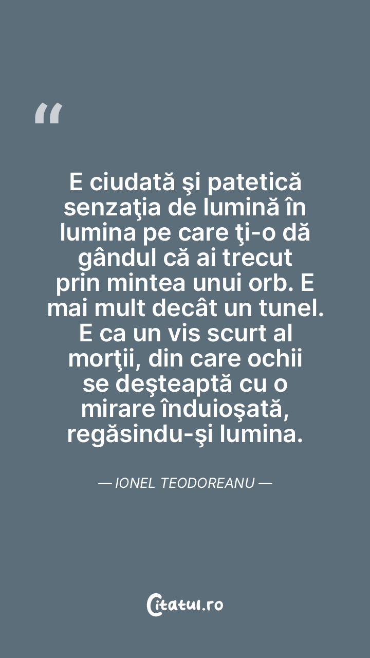 E ciudată şi patetică senzaţia de lumină în lumina pe care ţi-o dă gândul că ai trecut prin mintea unui orb. E mai mult decât un tunel. E ca un vis scurt al morţii, din care ochii se deşteaptă cu o mirare înduioşată, regăsindu-şi lumina. Ionel Teodoreanu