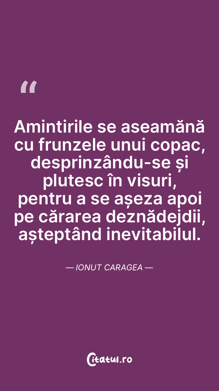Amintirile se aseamănă cu frunzele unui copac, desprinzându-se și plutesc în visuri, pentru a se așeza apoi pe cărarea deznădejdii, așteptând inevitabilul. Ionut Caragea