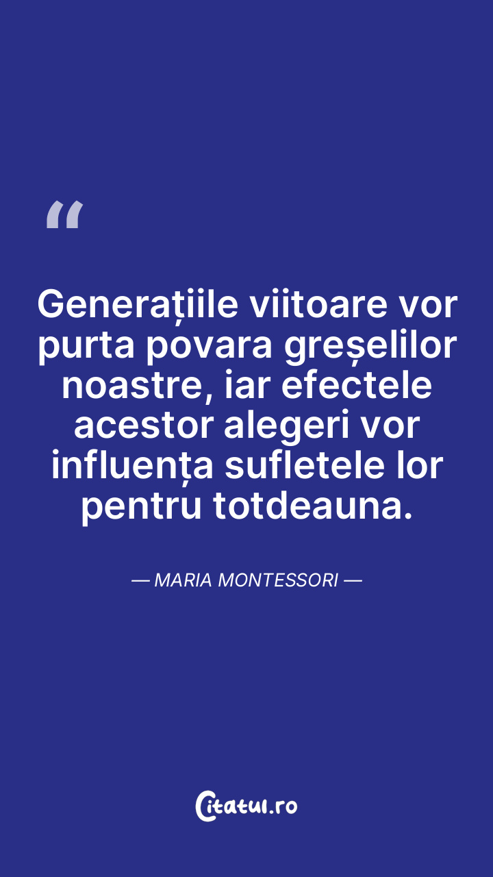Generațiile viitoare vor purta povara greșelilor noastre, iar efectele acestor alegeri vor influența sufletele lor pentru totdeauna. Maria Montessori