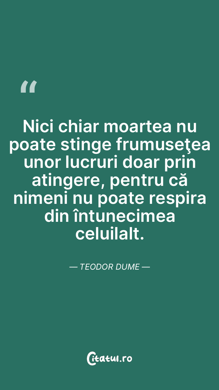 Nici chiar moartea nu poate stinge frumuseţea unor lucruri doar prin atingere, pentru că nimeni nu poate respira din întunecimea celuilalt. Teodor Dume