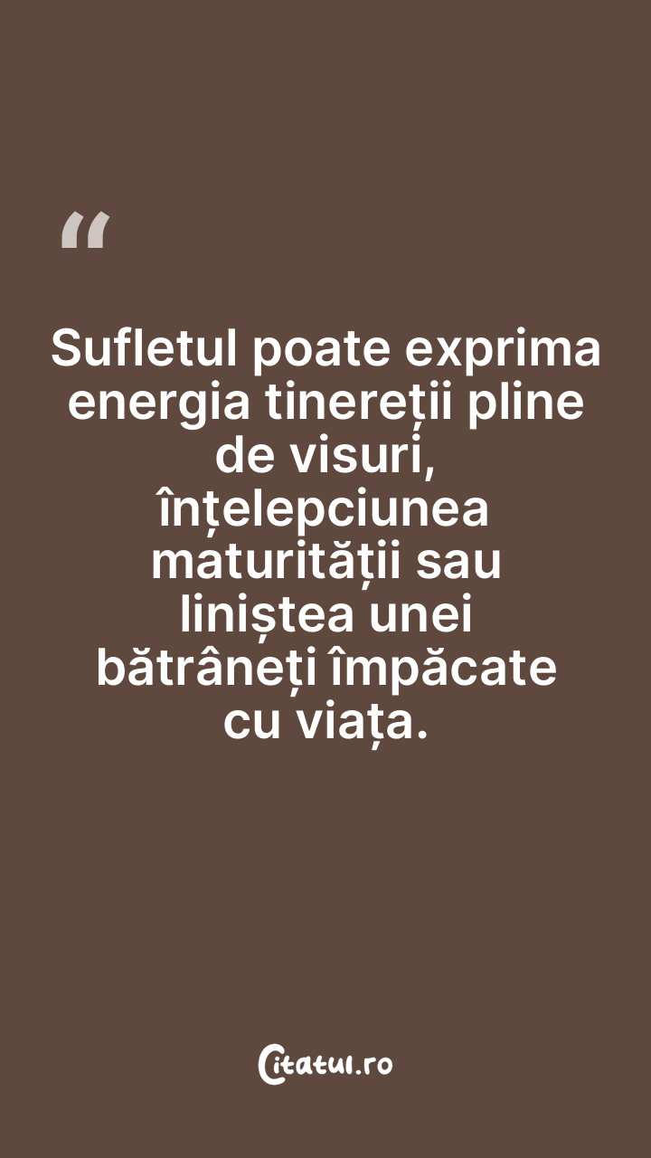 Sufletul poate exprima energia tinereții pline de visuri, înțelepciunea maturității sau liniștea unei bătrâneți împăcate cu viața.