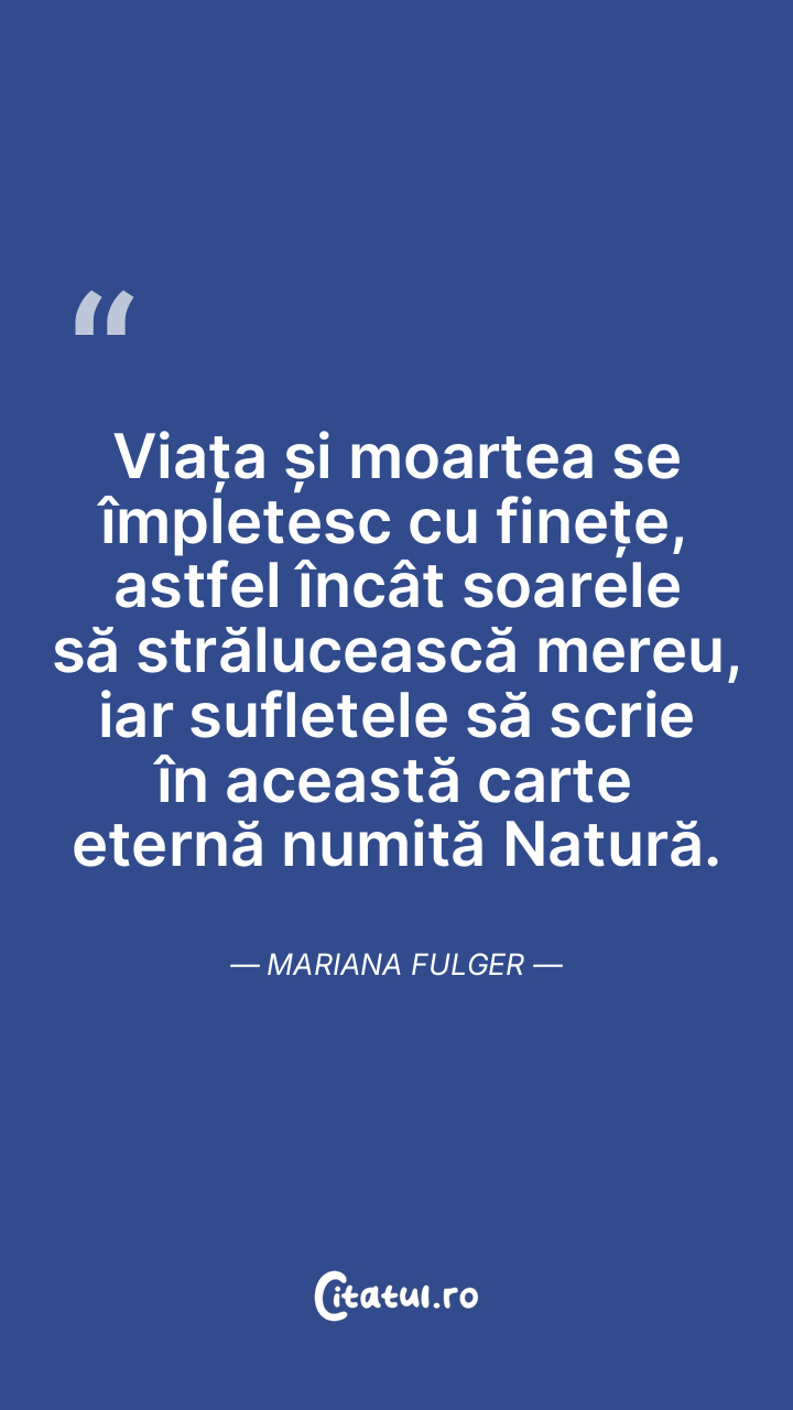 Viața și moartea se împletesc cu finețe, astfel încât soarele să strălucească mereu, iar sufletele să scrie în această carte eternă numită Natură. Mariana Fulger