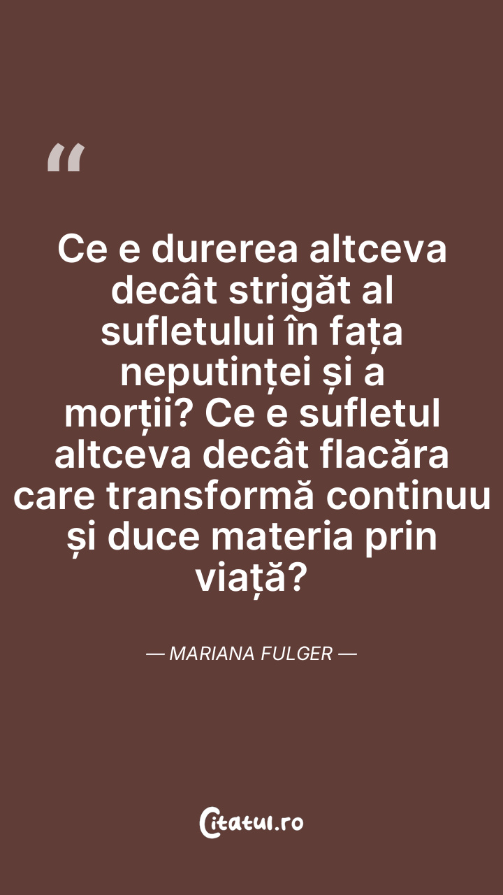 Ce e durerea altceva decât strigăt al sufletului în fața neputinței și a morții? Ce e sufletul altceva decât flacăra care transformă continuu și duce materia prin viață? Mariana Fulger