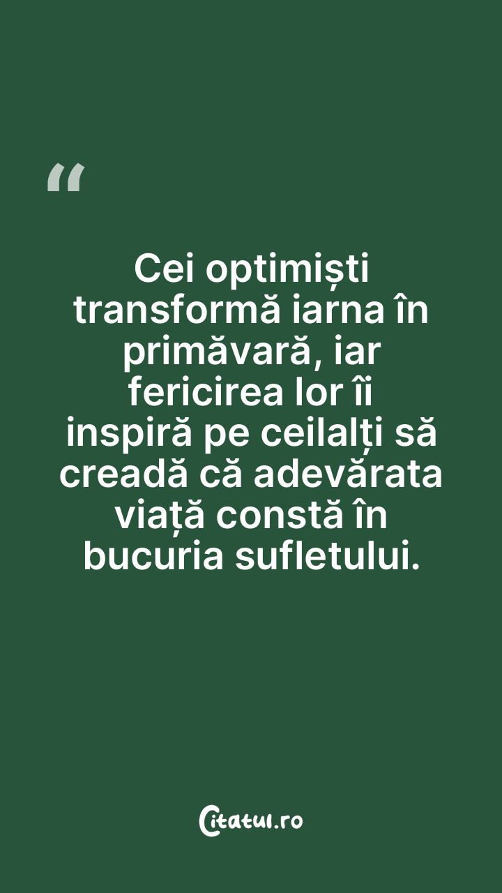Cei optimiști transformă iarna în primăvară, iar fericirea lor îi inspiră pe ceilalți să creadă că adevărata viață constă în bucuria sufletului.