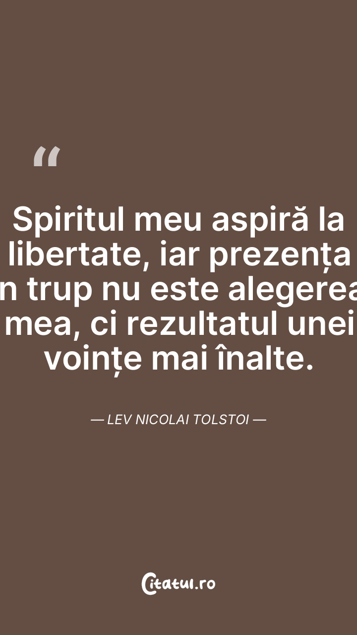 Spiritul meu aspiră la libertate, iar prezența în trup nu este alegerea mea, ci rezultatul unei voințe mai înalte. Lev Nicolai Tolstoi