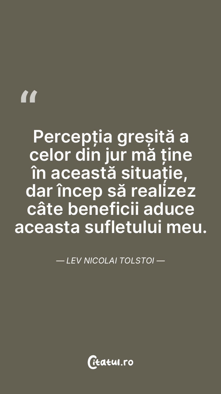 Percepția greșită a celor din jur mă ține în această situație, dar încep să realizez câte beneficii aduce aceasta sufletului meu. Lev Nicolai Tolstoi