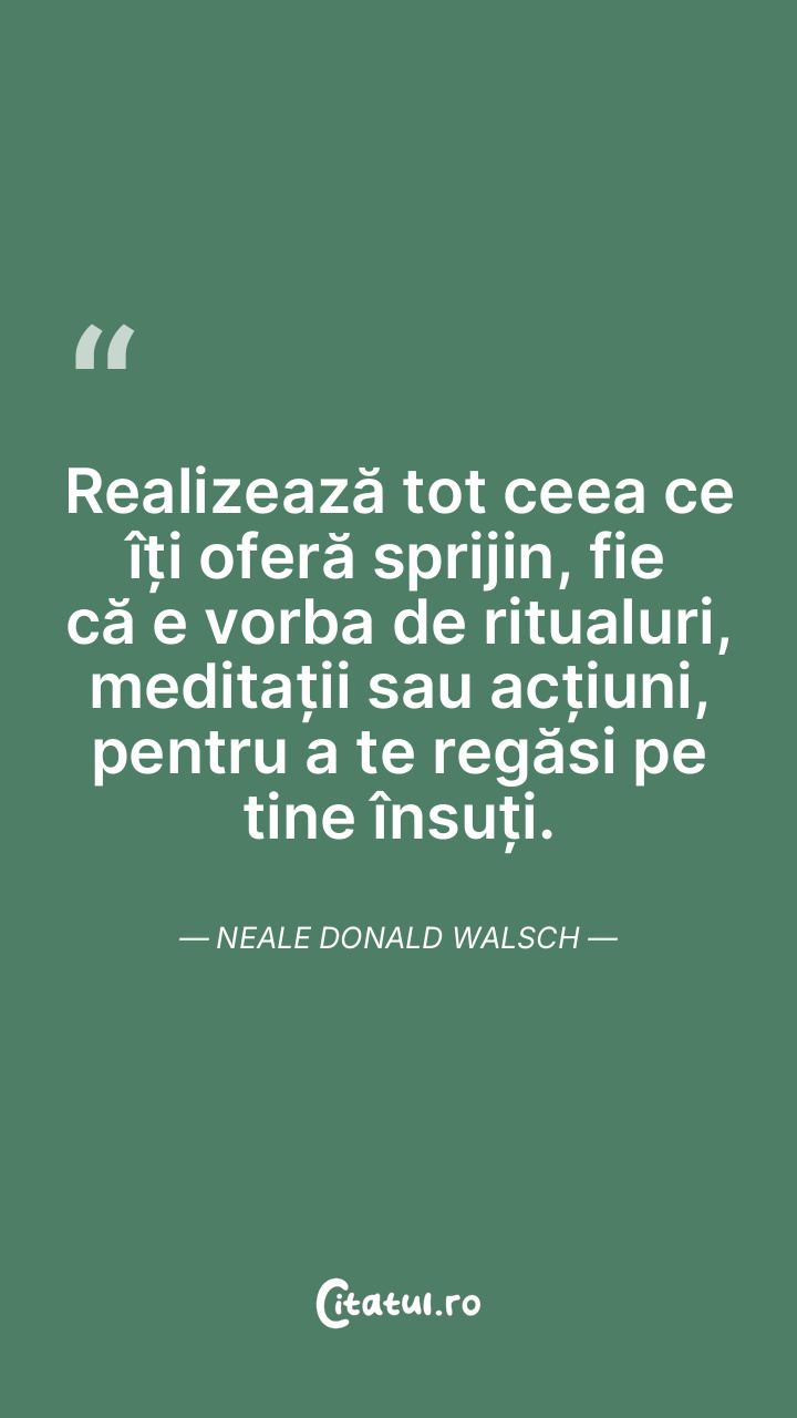 Realizează tot ceea ce îți oferă sprijin, fie că e vorba de ritualuri, meditații sau acțiuni, pentru a te regăsi pe tine însuți. Neale Donald Walsch
