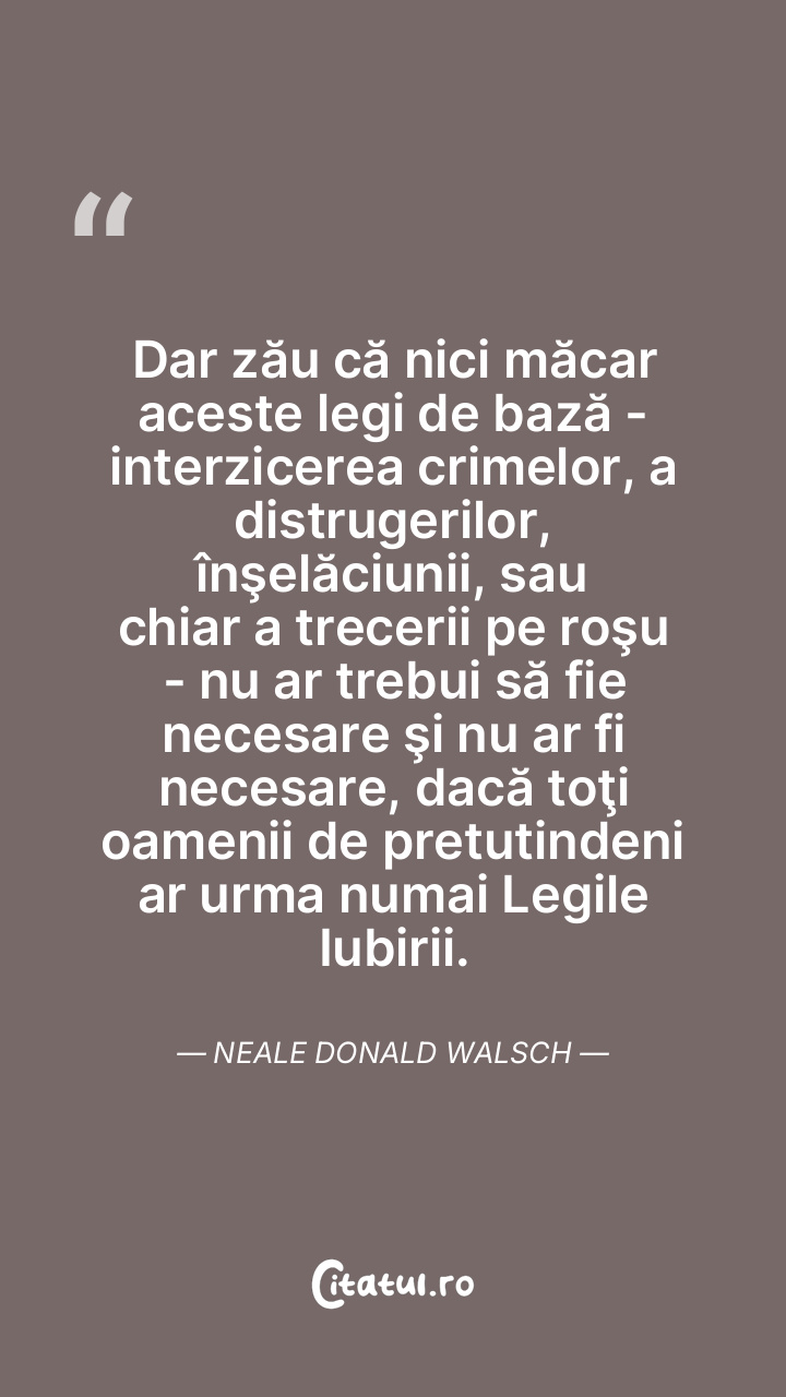 Dar zău că nici măcar aceste legi de bază - interzicerea crimelor, a distrugerilor, înşelăciunii, sau chiar a trecerii pe roşu - nu ar trebui să fie necesare şi nu ar fi necesare, dacă toţi oamenii de pretutindeni ar urma numai Legile Iubirii. Neale Donald Walsch