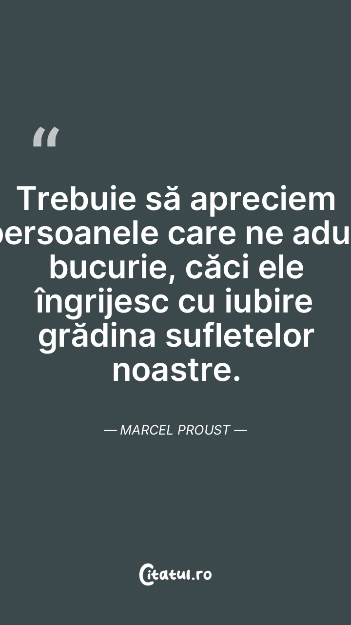 Trebuie să apreciem persoanele care ne aduc bucurie, căci ele îngrijesc cu iubire grădina sufletelor noastre. Marcel Proust