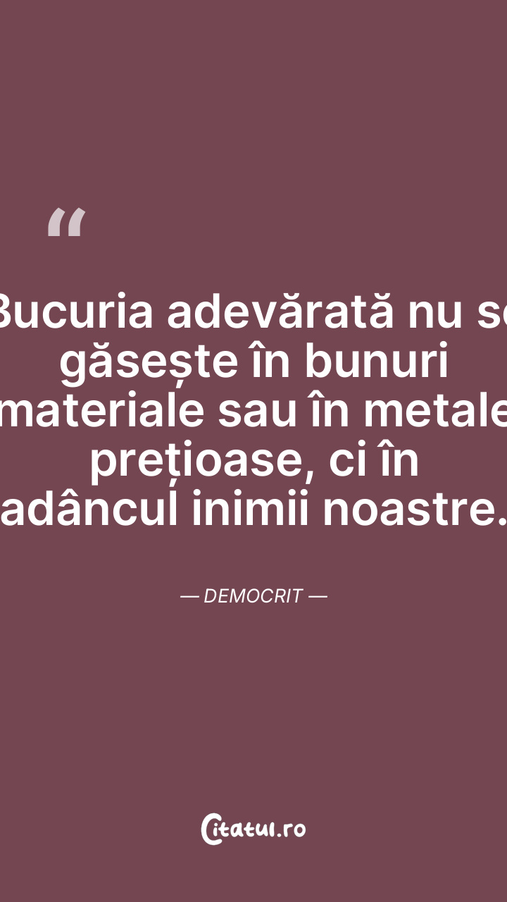 Bucuria adevărată nu se găsește în bunuri materiale sau în metale prețioase, ci în adâncul inimii noastre. Democrit