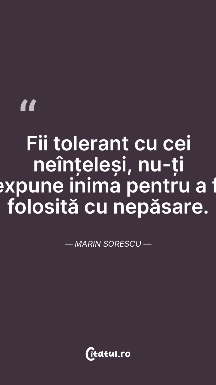 Fii tolerant cu cei neînțeleși, nu-ți expune inima pentru a fi folosită cu nepăsare. Marin Sorescu