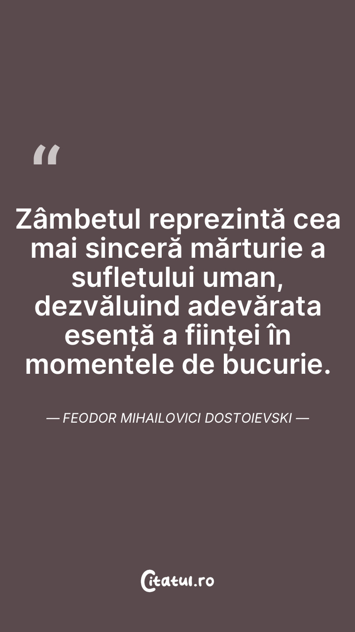 Zâmbetul reprezintă cea mai sinceră mărturie a sufletului uman, dezvăluind adevărata esență a ființei în momentele de bucurie. Feodor Mihailovici Dostoievski