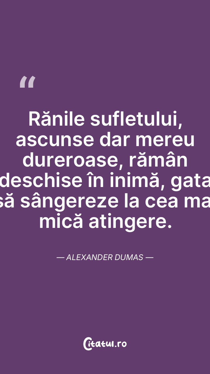 Rănile sufletului, ascunse dar mereu dureroase, rămân deschise în inimă, gata să sângereze la cea mai mică atingere. Alexander Dumas
