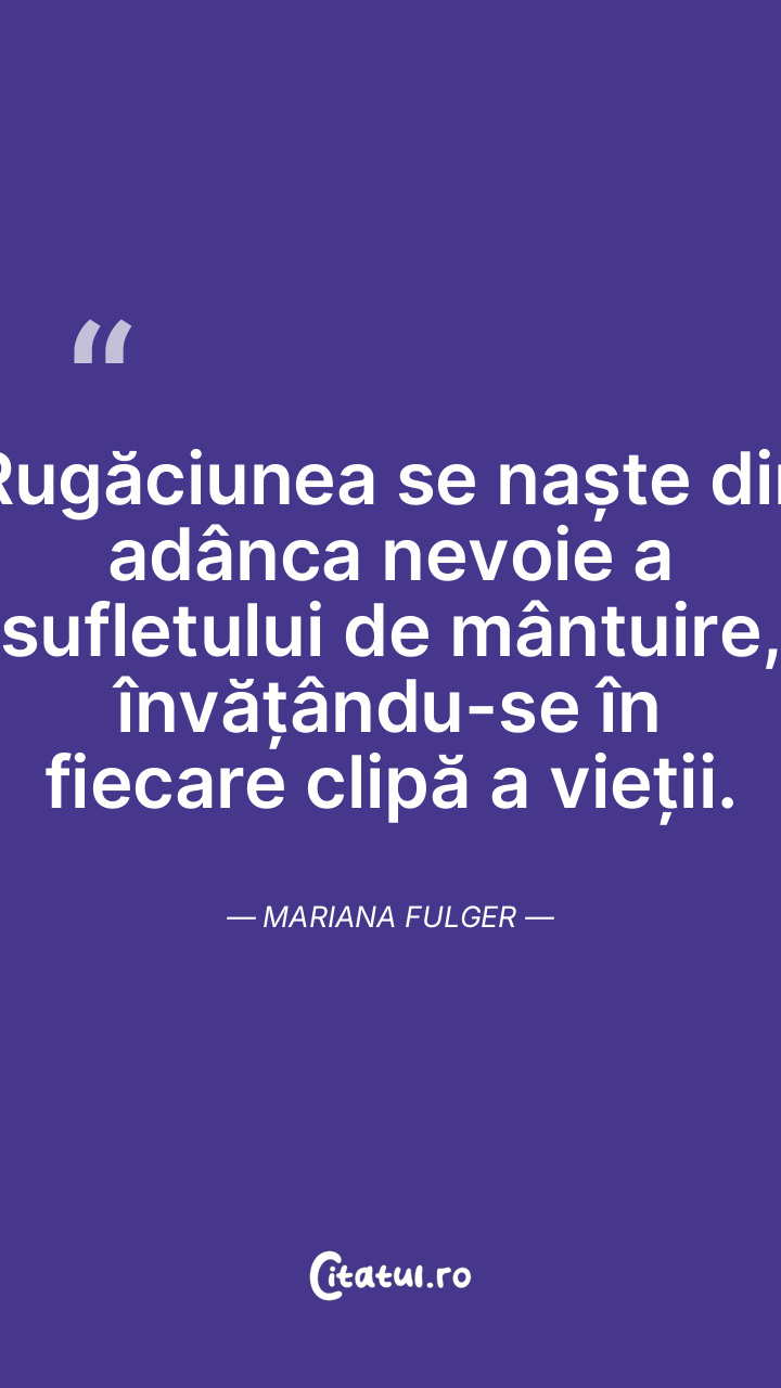 Rugăciunea se naște din adânca nevoie a sufletului de mântuire, învățându-se în fiecare clipă a vieții. Mariana Fulger