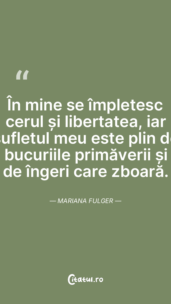 În mine se împletesc cerul și libertatea, iar sufletul meu este plin de bucuriile primăverii și de îngeri care zboară. Mariana Fulger