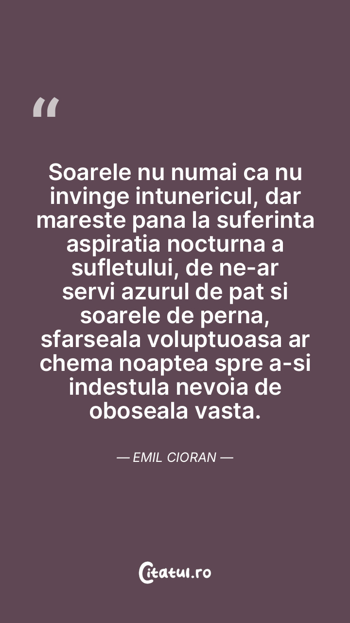 Soarele nu numai ca nu invinge intunericul, dar mareste pana la suferinta aspiratia nocturna a sufletului, de ne-ar servi azurul de pat si soarele de perna, sfarseala voluptuoasa ar chema noaptea spre a-si indestula nevoia de oboseala vasta. Emil Cioran