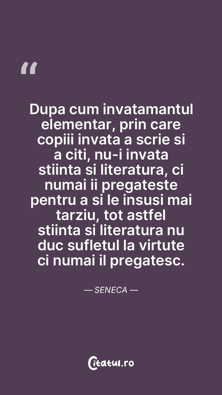 Dupa cum invatamantul elementar, prin care copiii invata a scrie si a citi, nu-i invata stiinta si literatura, ci numai ii pregateste pentru a si le insusi mai tarziu, tot astfel stiinta si literatura nu duc sufletul la virtute ci numai il pregatesc. Seneca