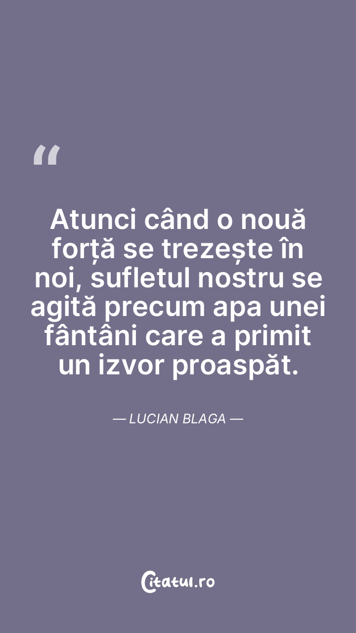 Atunci când o nouă forță se trezește în noi, sufletul nostru se agită precum apa unei fântâni care a primit un izvor proaspăt. Lucian Blaga