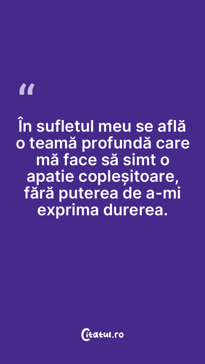 În sufletul meu se află o teamă profundă care mă face să simt o apatie copleșitoare, fără puterea de a-mi exprima durerea.