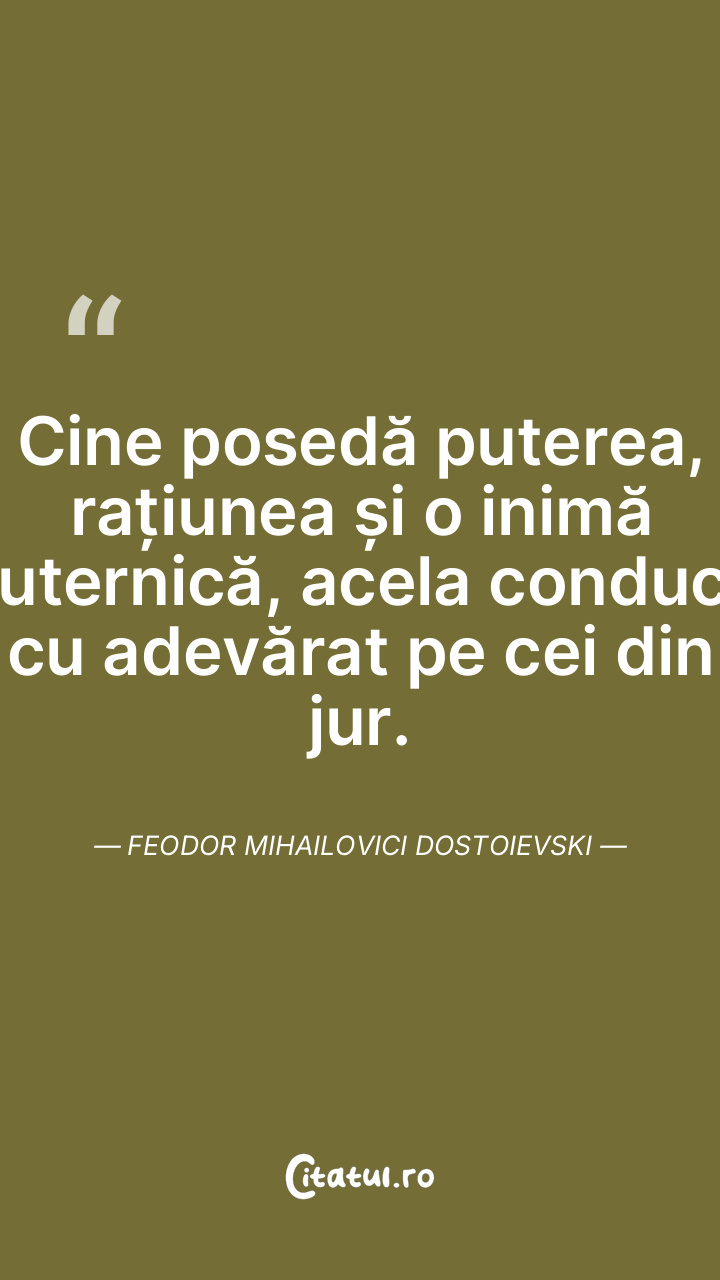 Cine posedă puterea, rațiunea și o inimă puternică, acela conduce cu adevărat pe cei din jur. Feodor Mihailovici Dostoievski