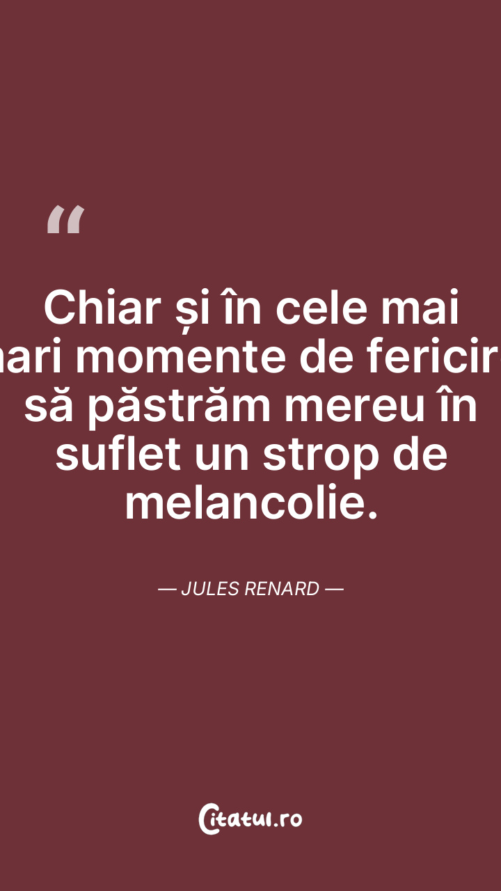 Chiar și în cele mai mari momente de fericire, să păstrăm mereu în suflet un strop de melancolie. Jules Renard