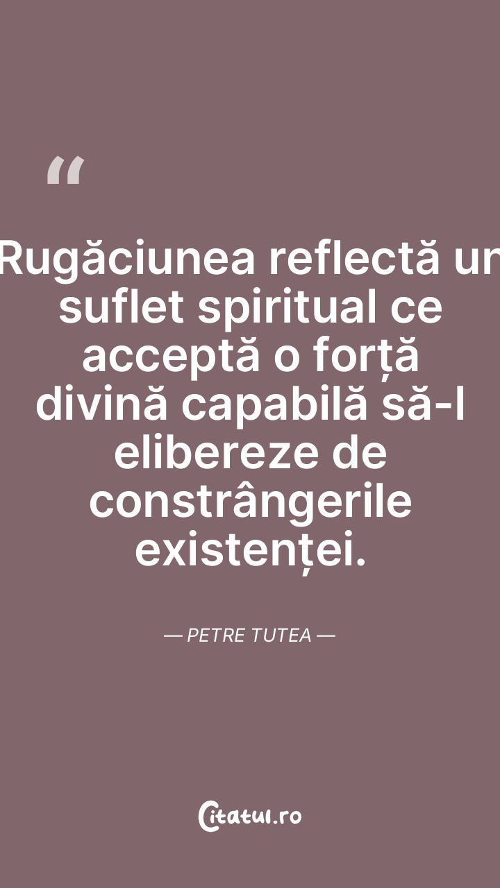 Rugăciunea reflectă un suflet spiritual ce acceptă o forță divină capabilă să-l elibereze de constrângerile existenței. Petre Tutea