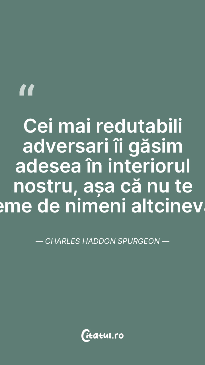 Cei mai redutabili adversari îi găsim adesea în interiorul nostru, așa că nu te teme de nimeni altcineva. Charles Haddon Spurgeon