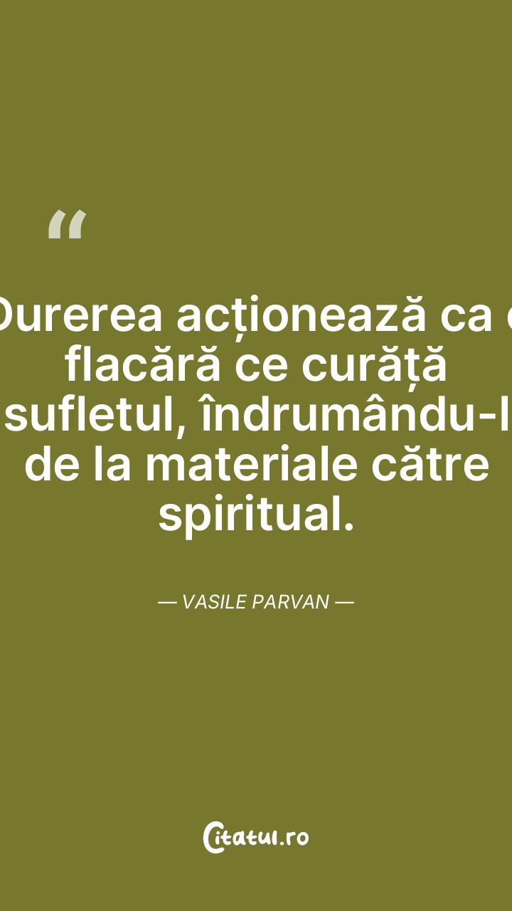 Durerea acționează ca o flacără ce curăță sufletul, îndrumându-l de la materiale către spiritual. Vasile Parvan