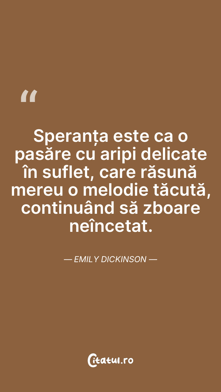 Speranța este ca o pasăre cu aripi delicate în suflet, care răsună mereu o melodie tăcută, continuând să zboare neîncetat. Emily Dickinson