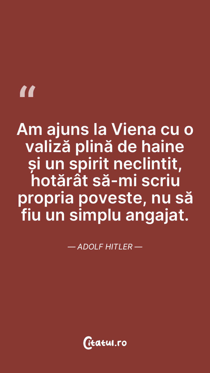 Am ajuns la Viena cu o valiză plină de haine și un spirit neclintit, hotărât să-mi scriu propria poveste, nu să fiu un simplu angajat. Adolf Hitler