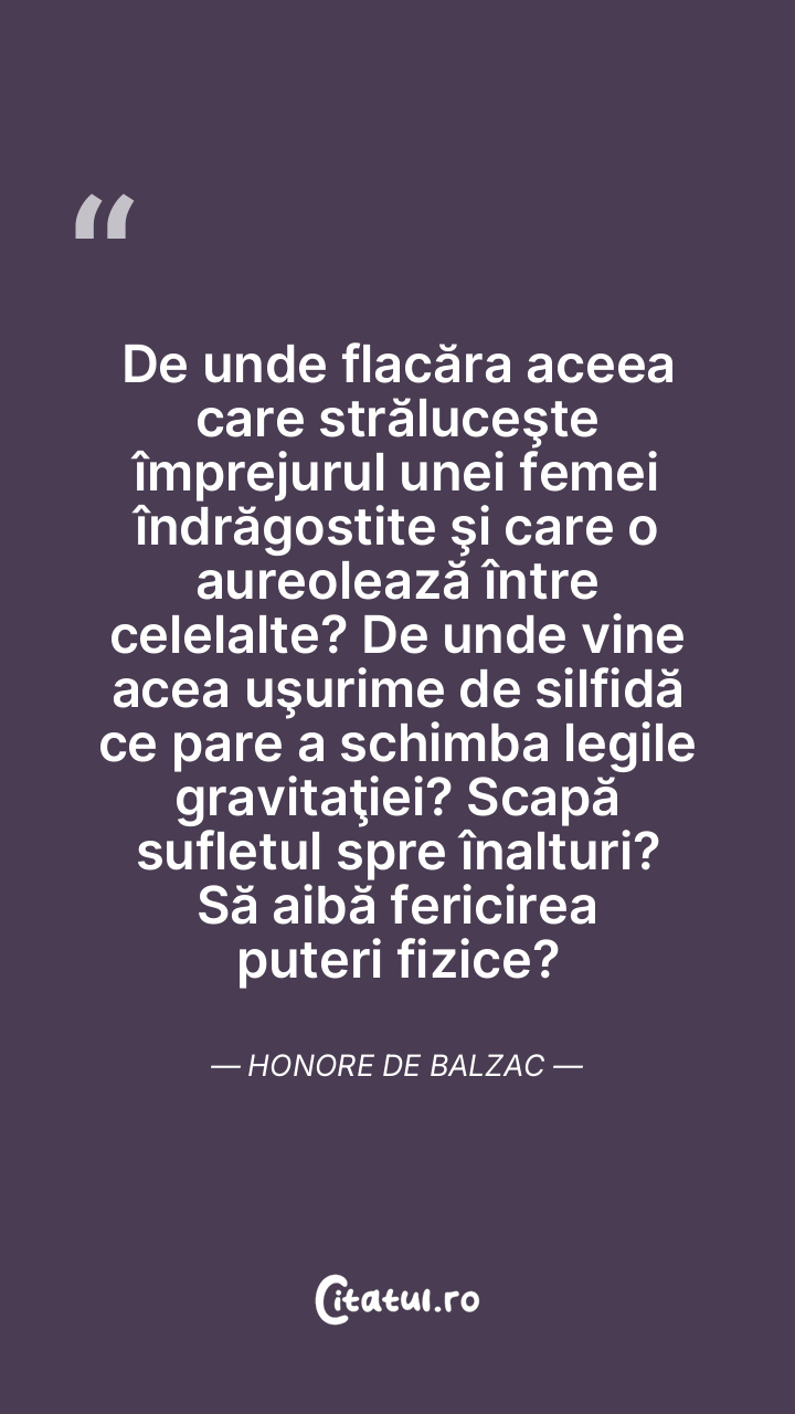 De unde flacăra aceea care străluceşte împrejurul unei femei îndrăgostite şi care o aureolează între celelalte? De unde vine acea uşurime de silfidă ce pare a schimba legile gravitaţiei? Scapă sufletul spre înalturi? Să aibă fericirea puteri fizice? Honore de Balzac