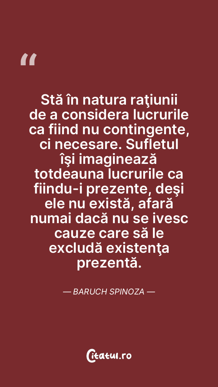 Stă în natura raţiunii de a considera lucrurile ca fiind nu contingente, ci necesare. Sufletul îşi imaginează totdeauna lucrurile ca fiindu-i prezente, deşi ele nu există, afară numai dacă nu se ivesc cauze care să le excludă existenţa prezentă. Baruch Spinoza