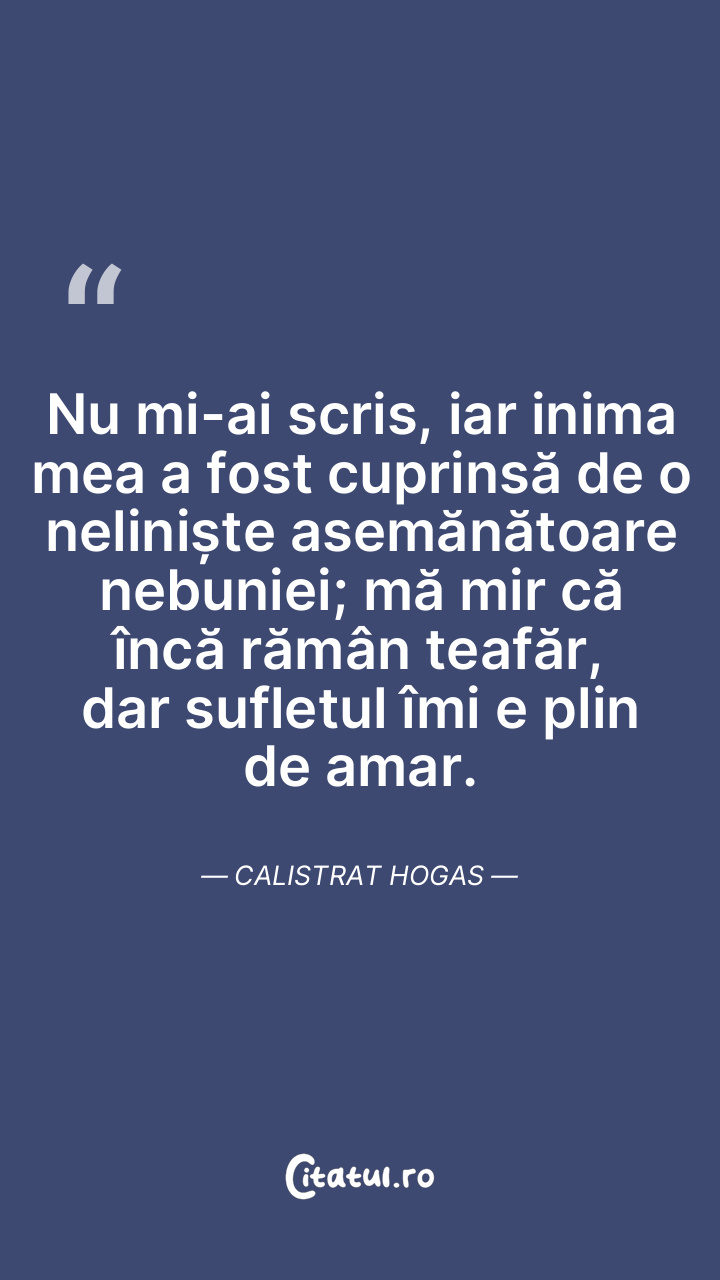 Nu mi-ai scris, iar inima mea a fost cuprinsă de o neliniște asemănătoare nebuniei; mă mir că încă rămân teafăr, dar sufletul îmi e plin de amar. Calistrat Hogas