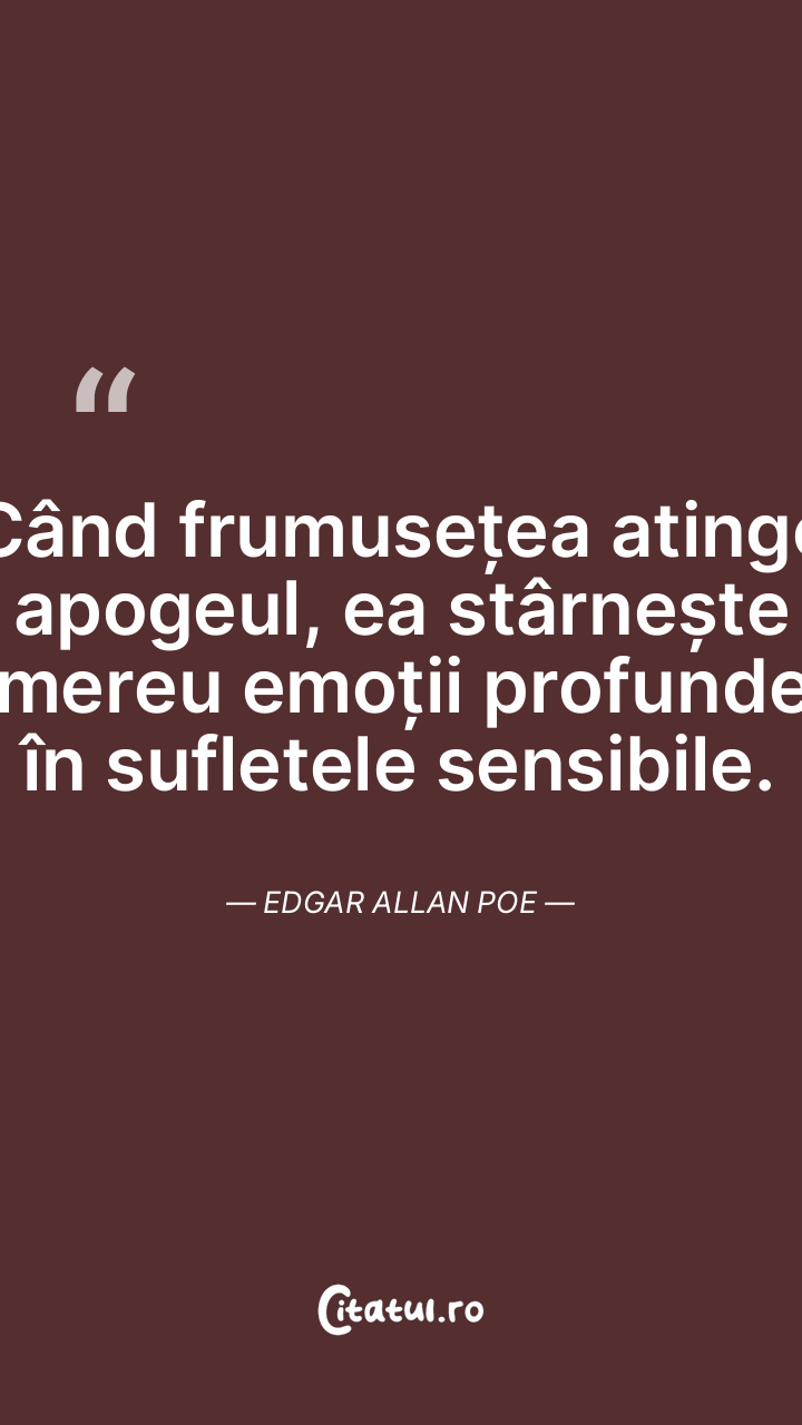 Când frumusețea atinge apogeul, ea stârnește mereu emoții profunde în sufletele sensibile. Edgar Allan Poe