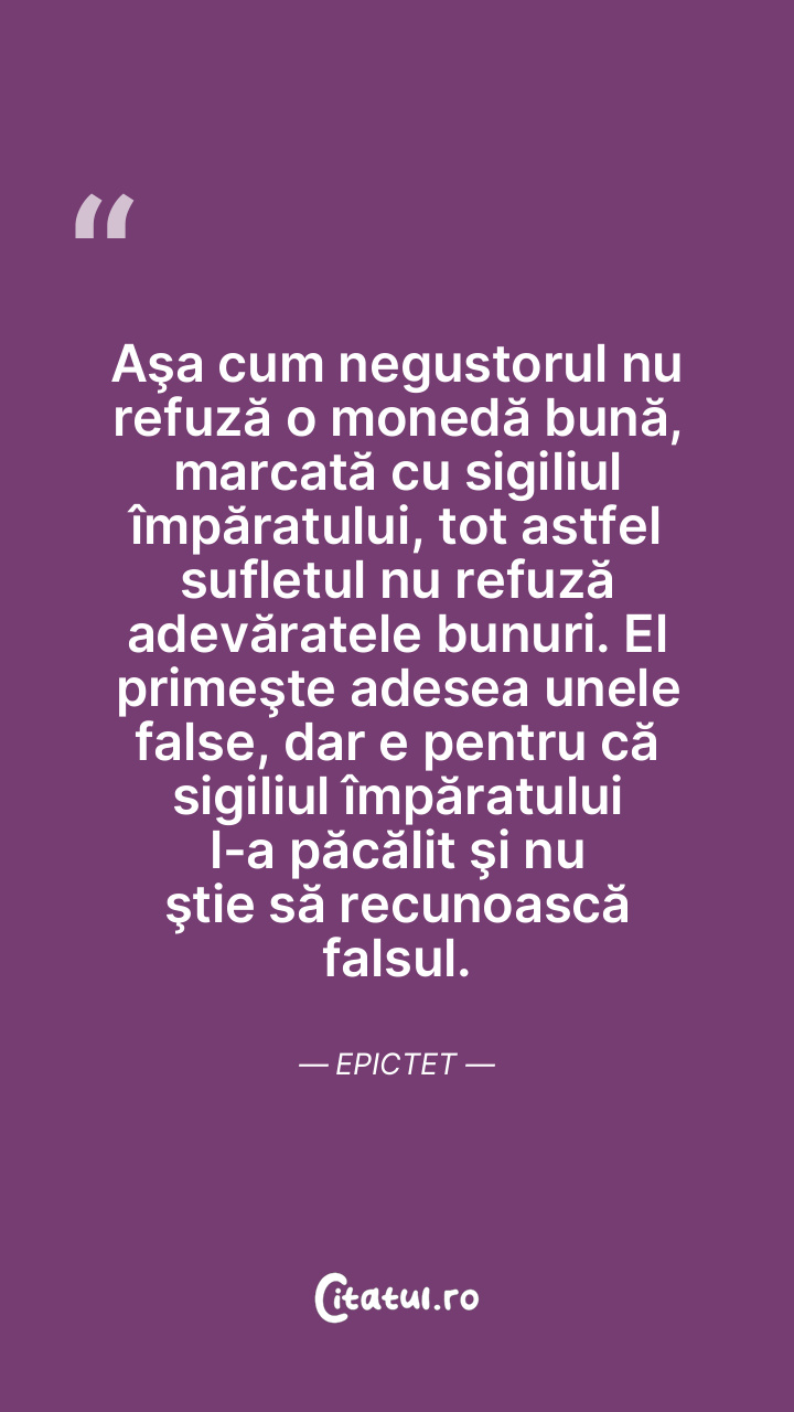 Aşa cum negustorul nu refuză o monedă bună, marcată cu sigiliul împăratului, tot astfel sufletul nu refuză adevăratele bunuri. El primeşte adesea unele false, dar e pentru că sigiliul împăratului l-a păcălit şi nu ştie să recunoască falsul. Epictet