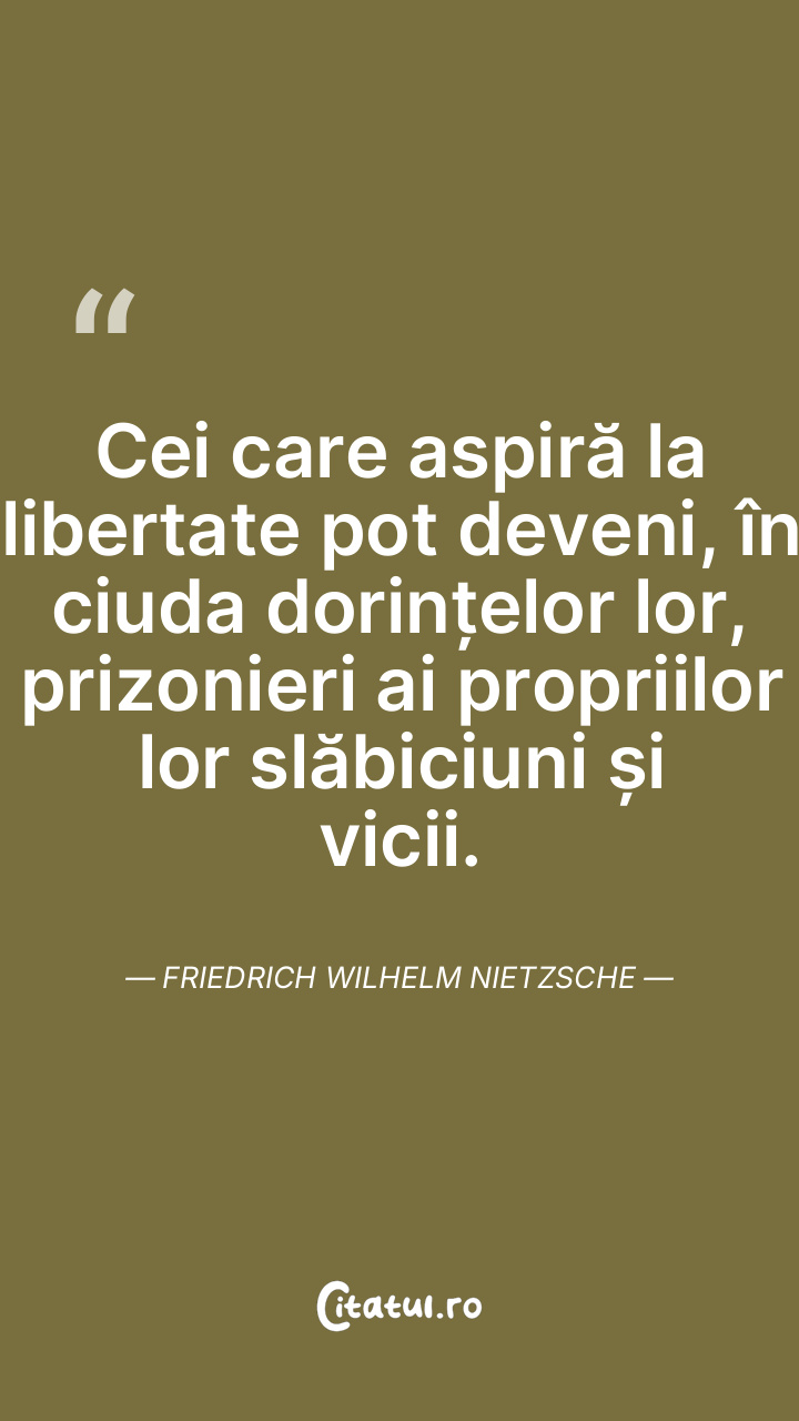 Cei care aspiră la libertate pot deveni, în ciuda dorințelor lor, prizonieri ai propriilor lor slăbiciuni și vicii. Friedrich Wilhelm Nietzsche