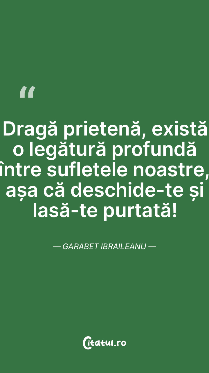 Dragă prietenă, există o legătură profundă între sufletele noastre, așa că deschide-te și lasă-te purtată! Garabet Ibraileanu