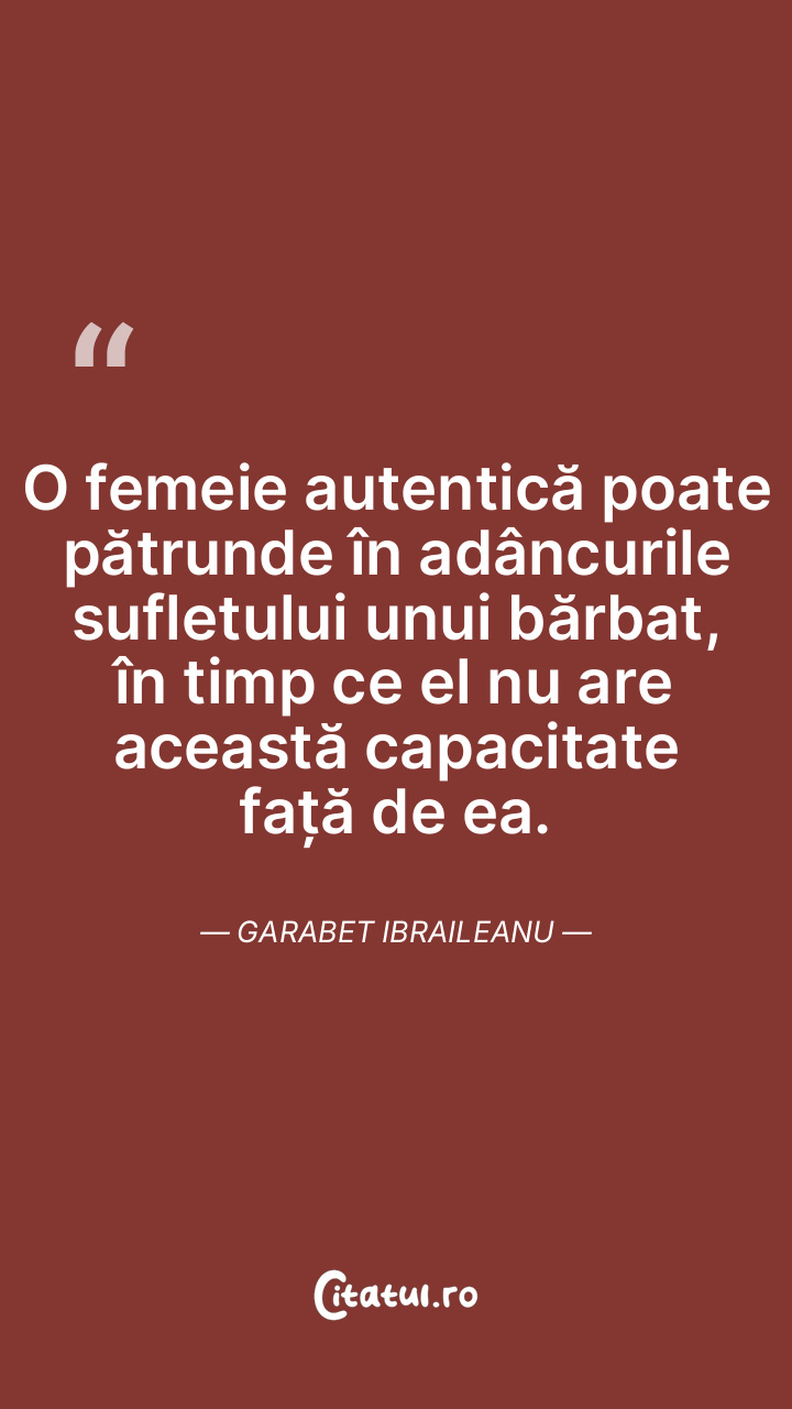 O femeie autentică poate pătrunde în adâncurile sufletului unui bărbat, în timp ce el nu are această capacitate față de ea. Garabet Ibraileanu