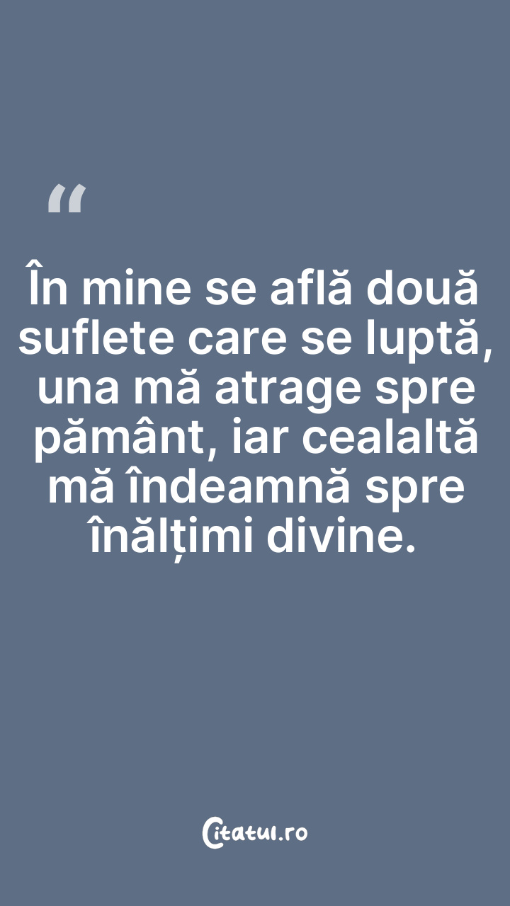 În mine se află două suflete care se luptă, una mă atrage spre pământ, iar cealaltă mă îndeamnă spre înălțimi divine.