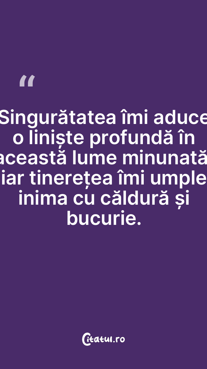 Singurătatea îmi aduce o liniște profundă în această lume minunată, iar tinerețea îmi umple inima cu căldură și bucurie.