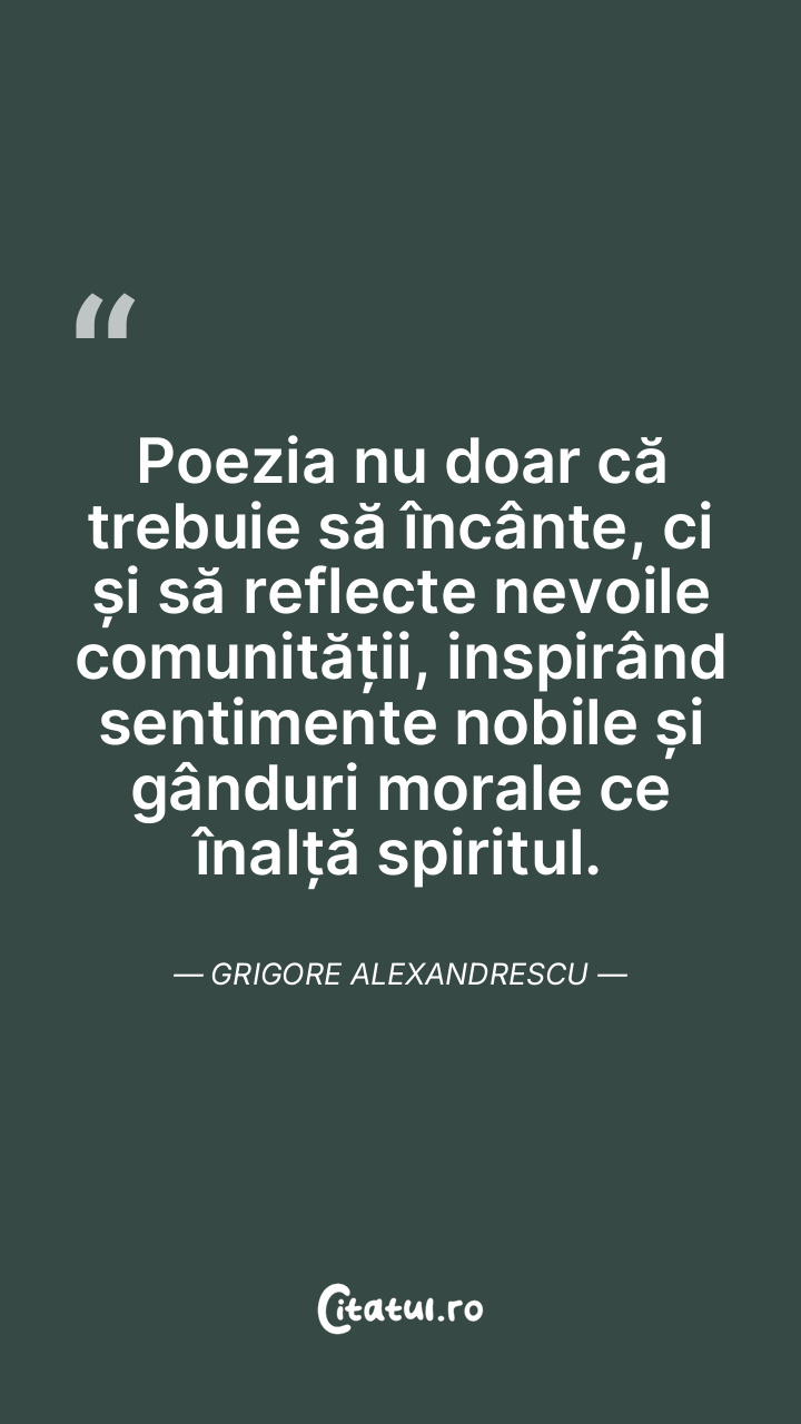 Poezia nu doar că trebuie să încânte, ci și să reflecte nevoile comunității, inspirând sentimente nobile și gânduri morale ce înalță spiritul. Grigore Alexandrescu