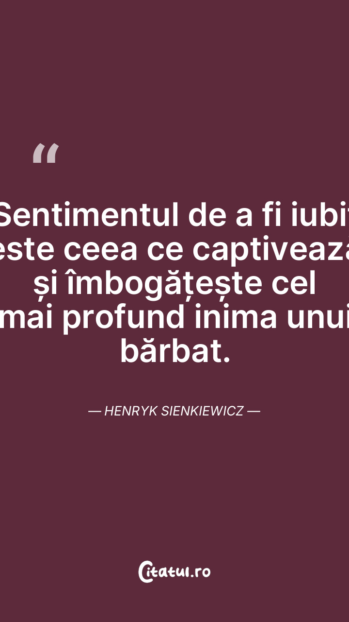 Sentimentul de a fi iubit este ceea ce captivează și îmbogățește cel mai profund inima unui bărbat. Henryk Sienkiewicz