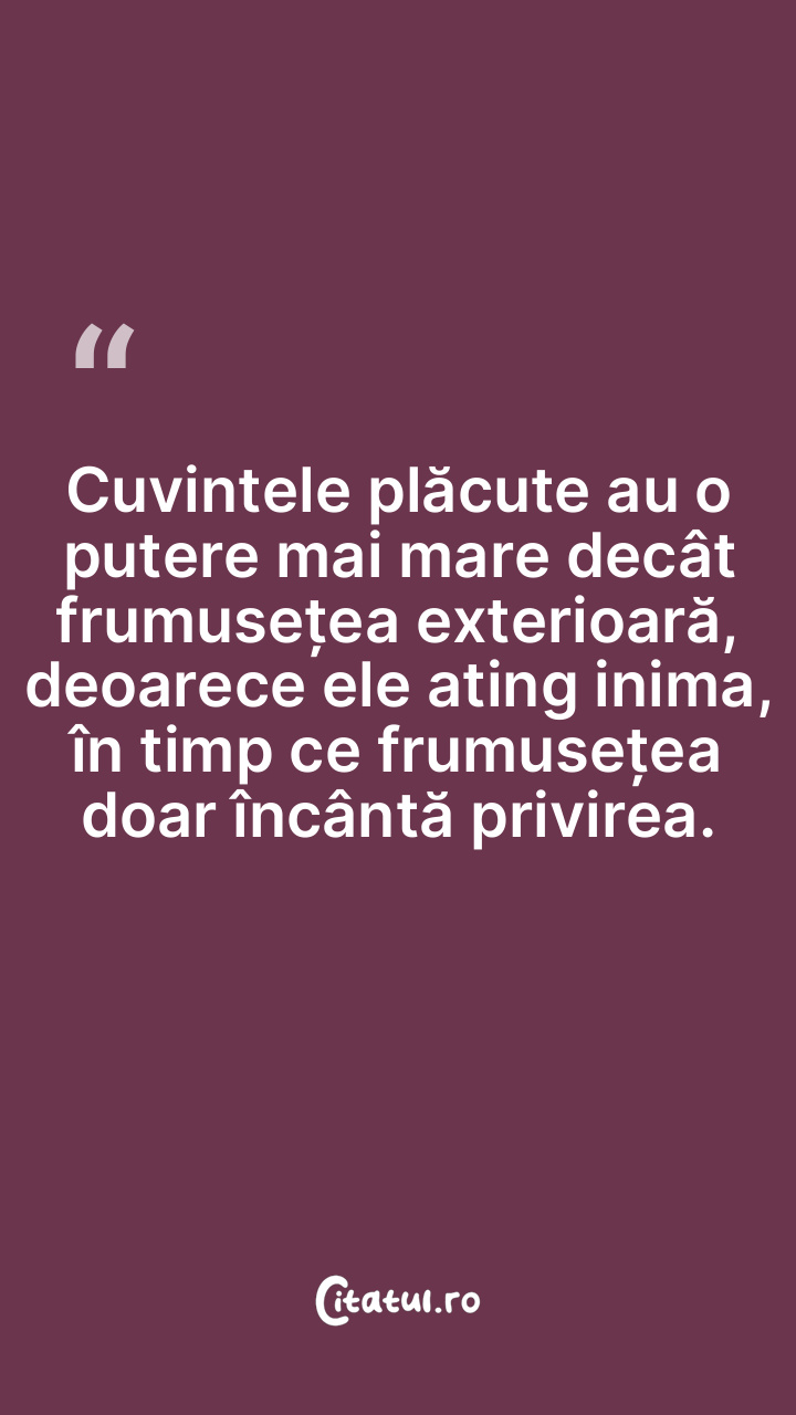Cuvintele plăcute au o putere mai mare decât frumusețea exterioară, deoarece ele ating inima, în timp ce frumusețea doar încântă privirea.