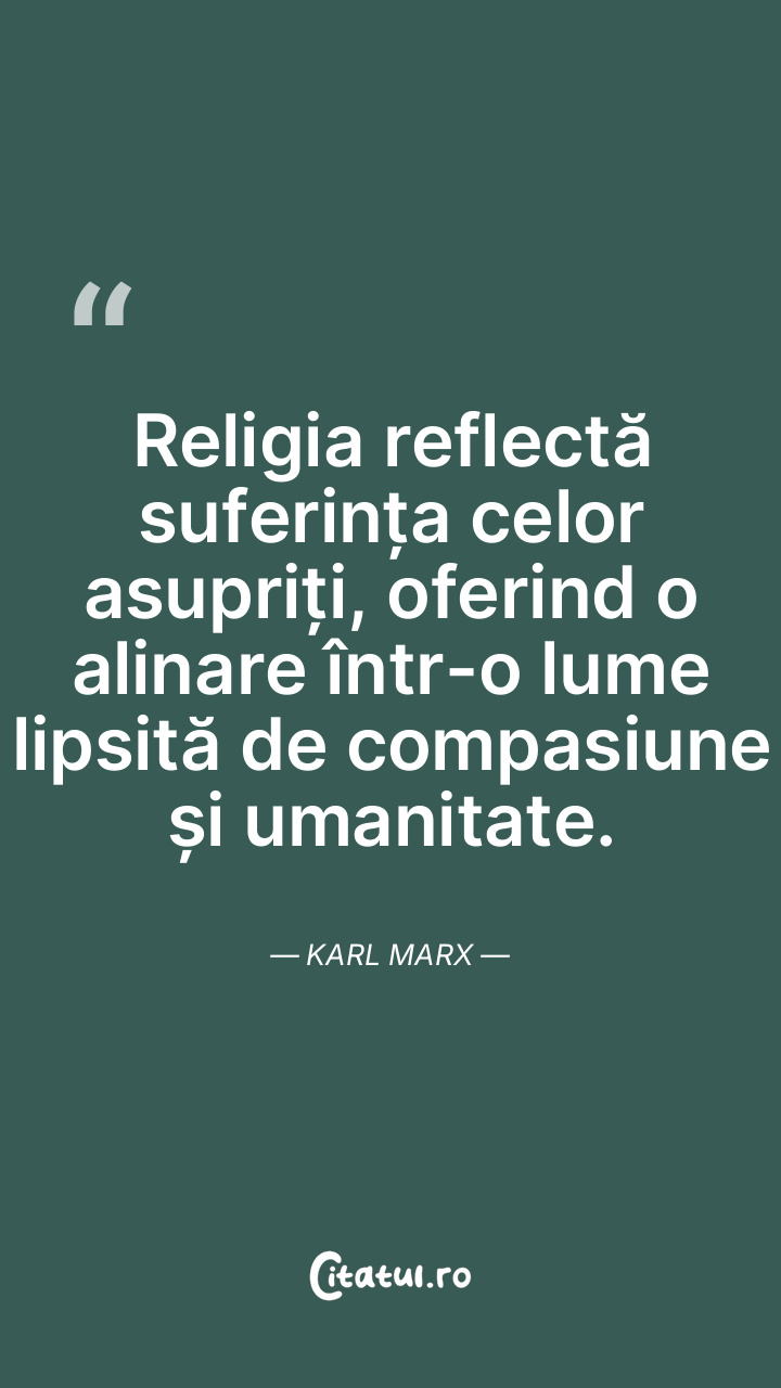 Religia reflectă suferința celor asupriți, oferind o alinare într-o lume lipsită de compasiune și umanitate. Karl Marx