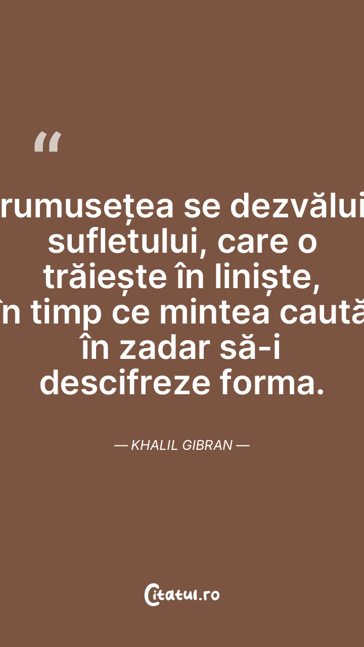 Frumusețea se dezvăluie sufletului, care o trăiește în liniște, în timp ce mintea caută în zadar să-i descifreze forma. Khalil Gibran