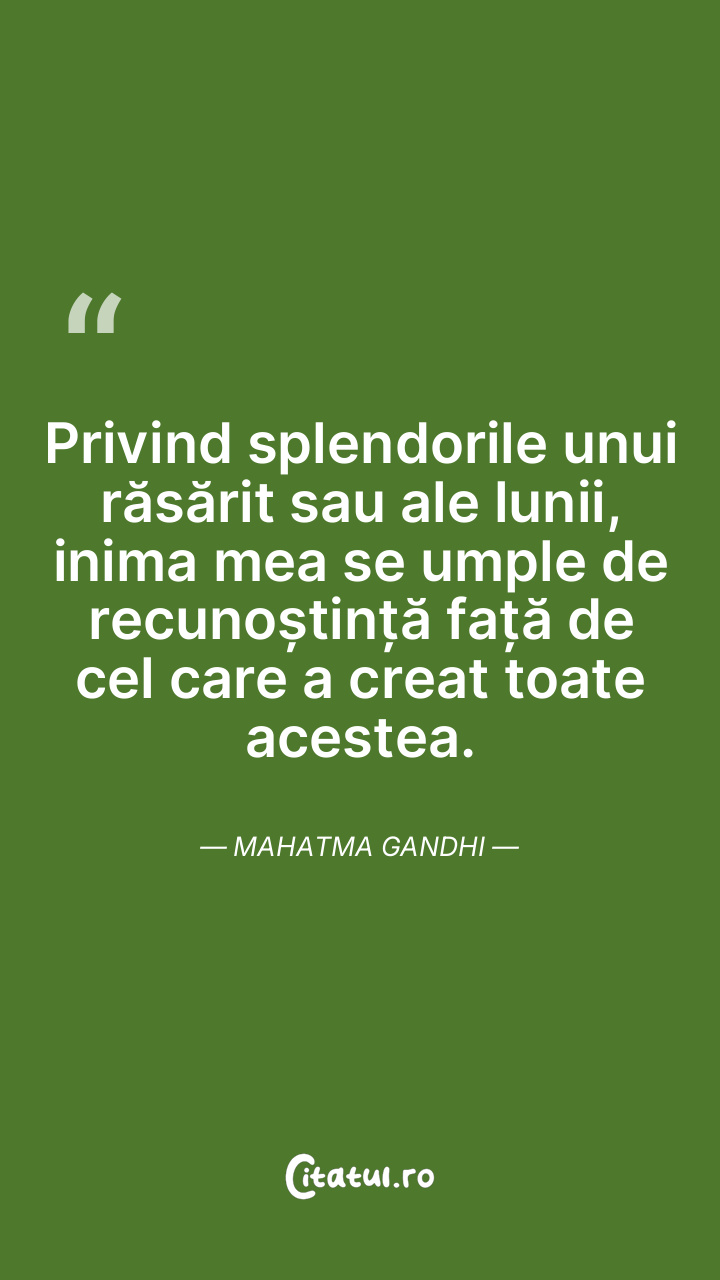 Privind splendorile unui răsărit sau ale lunii, inima mea se umple de recunoștință față de cel care a creat toate acestea. Mahatma Gandhi